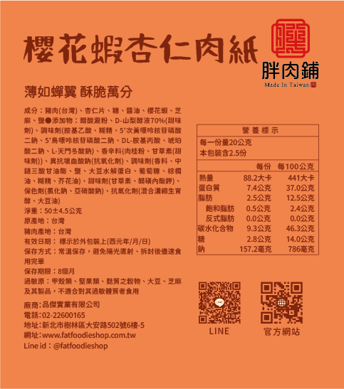 規格:芝麻杏仁肉紙60g/盒、櫻花蝦杏仁肉紙50g/盒